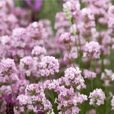 Цветение Лаванды узколистной Розеа длится с июля по август. Мелкие с розоватым оттенком, цветки, собранные в колосовидные соцветия. Обладают приятным ароматом, который сильнее всего сразу после распускания цветков.