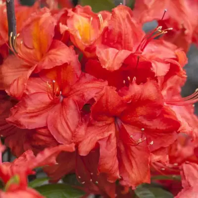 Очарование рододендрона "Фейерверк" заключено в его соцветиях. Округлые крупные соцветия, состоящие из 6-12 отдельных цветов, являются главным украшением куста. Покров крупный, имеющий диаметр около 8 см, воронковидной формы. Соцветия огненно-красного цвета с заметным оранжевым оттенком создают впечатляющий визуальный эффект, напоминая настоящий фейерверк. Эффект усиливается приятным ароматом цветов.