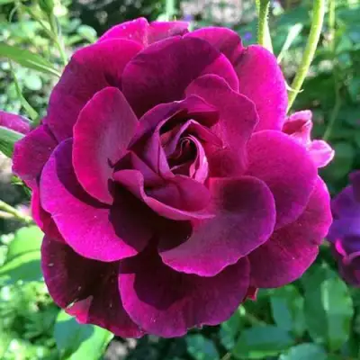 Цветок этой розы имеет густо-сливовый оттенок, который почти переходит в пурпурный цвет, а его изнанка окрашена в дымчато-сиреневый тон. Основной цвет цветка является фиолетовым, насыщенность которого можно охарактеризовать как темную. Форма цветка - чашевидная, а его диаметр составляет от 7 до 8 см. Количество лепестков на цветке может варьироваться от 30 до 40, а они располагаются в соцветиях. На каждом стебле образуется от 3 до 5 цветков.